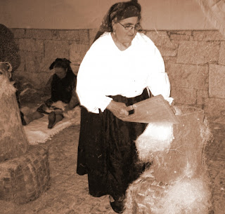 1 - A mulher segura a estriga na mão esquerda sobre a borda do cortiço, e com a espadela na mão direita, sacode as arestas para o exterior, seguidamente saem os tomentos.